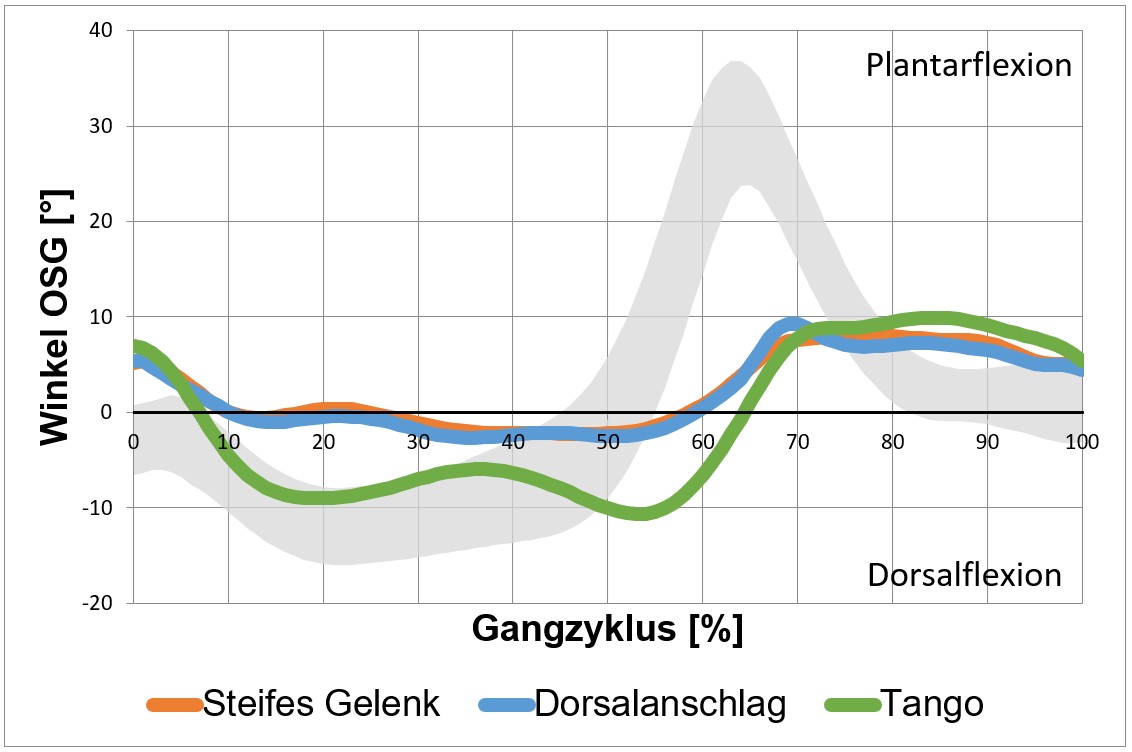 Aus diesem Grund ist für Patienten mit insuffizienter Wadenmuskulatur, die über eine entsprechende OSG-Beweglichkeit verfügen und die im Alltag häufig Situationen mit wechselnden Untergründen zu bewältigen haben, die Versorgung mit einer im Knöchelgelenk beweglichen Unterschenkelorthese vorteilhaft. Im Folgenden wird ein Orthesenknöchelgelenk mit vergrößerter Bewegungsamplitude und einstellbaren Widerständen für die Plantarflexion und Dorsalextension vorgestellt. Abschließend werden die Vorteile des Systems mit Hilfe biomechanischer Parameter exemplarisch dargestellt.