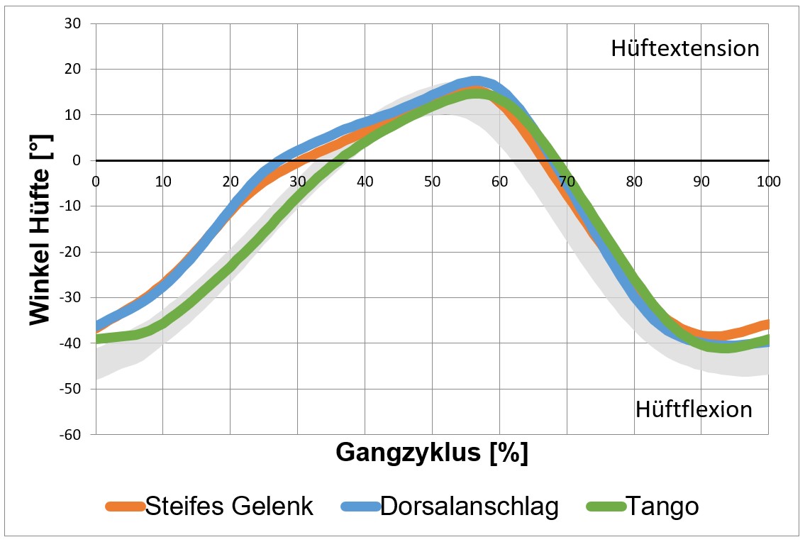 Die ganganalytischen Daten (Abb. 6) untermauern die Aussagen des Patienten: Der größere Bewegungsumfang des oberen Sprunggelenkes mit dem Gelenk “Nexgear Tango” (Abb. 6a) fördert die Knieflexion unter Belastung (Abb. 6b). Dies führt weiter zu einer physiologischeren Extensionsbewegung des Hüftgelenkes (Abb. 6c).