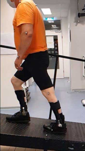 Weitere Vorteile des Systems werden bei der biomechanischen Analyse des Rampenaufwärtsgehens eindrucksvoll deutlich: In der linken Momentaufnahme von Abbildung 5 ist zu erkennen, dass sich in der Situation mit steifem Knöchelgelenk die für diese Gegebenheit erforderliche Dorsalextensionsbewegung mit entsprechender Vorfußlast sowie dem Abheben der Ferse kompensiert werden kann. Der Patient berichtet, dass es sehr anstrengend sei, die Schräge aufwärts zu gehen und dass sich die Orthesen in dieser Situation wie zusätzliche Hindernisse anfühlen, die überwunden werden müssen. Mit dem Gelenk “Nexgear Tango” hingegen kann sich der Winkel des oberen Sprunggelenkes der Untergrundneigung anpassen (Abb. 5b); der Patient spürt sogar einen Beschleunigungseffekt, der es ihm wesentlich erleichtert, die Schräge aufwärts zu bewältigen.