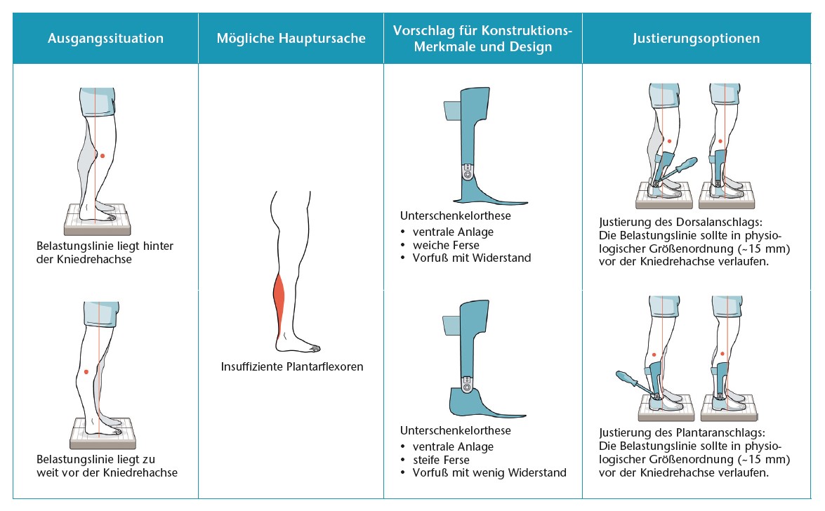 Das Orthesendesign bei einer Schwäche der Plantarflexoren sollte idealerweise mit einer ventralen Unterschenkelanlage gestaltet werden. Die ventrale Anlage bietet zum Ende der mittleren Standphase und zu Beginn der terminalen Standphase den Gegenhalt für die Federvorspannung, um dann schließlich die gewünschte Beschleunigung des Unterschenkels zu bewirken. Bei einem Genu recurvatum kann eine steife Ferse das kniebeugende Moment zusätzlich zur Federvorspannung verstärken (siehe Abb. 2).