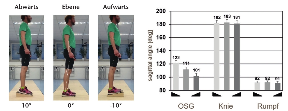 Für die Bewertung orthetischer Versorgungsoptionen ist es zunächst sinnvoll, die Anpassung des gesunden Bewegungsapparates an geneigte Untergründe zu analysieren. Abbildung 3 zeigt einen gesunden Probanden jeweils stehend auf einer um 10° abwärts geneigten Fläche, auf geradem Boden und auf einer um 10° aufwärts geneigten Fläche. Im dazugehörigen Balkendiagramm sind die einer Studie 9 entnommenen Mittelwerte von 40 Probanden für den OSG-Winkel, den Kniewinkel und die Rumpfneigung für die drei Situationen angegeben. Es wird deutlich, dass sich bei intakter OSG-Muskulatur ausschließlich das obere Sprunggelenk der jeweiligen Schrägen adaptiert; Kniewinkel und Rumpfneigung zeigen keine messbaren Anpassungen.