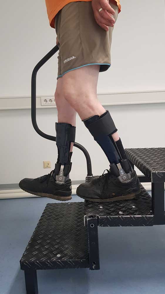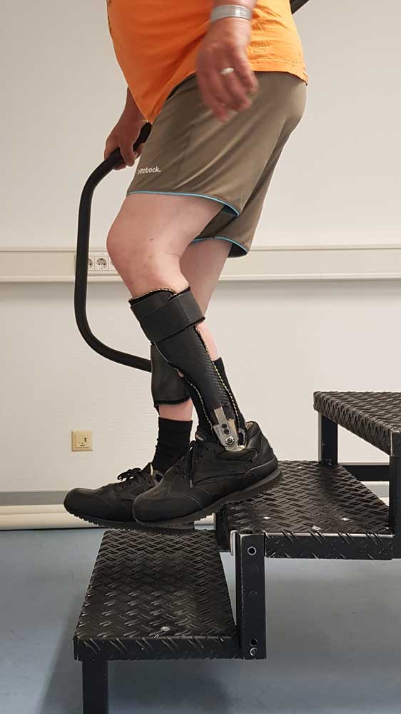 Ein weiterer grundsätzlicher Vorteil des Gelenkes lässt sich beim Treppabgehen beobachten: Während mit einer gelenklosen Orthese bzw. einer Orthese mit Dorsalanschlag die fehlende Dorsalextension nur mit dem Überrollen an der Stufenkante kompensiert werden kann, ermöglicht das Gelenk “Nexgear Tango” eine für den Patienten sicherere ganzsohlige Platzierung des Fußes auf der Stufe (Abb. 7).