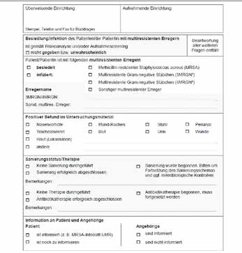 Im Falle einer Kolonisierung oder Infektion mit multiresistenten Keimen ist die Weitergabe von Informationen über eine MRE-Besiedlung von Patienten an die weiterbetreuende Institution (z. B. Rehaklinik, Pflegeeinrichtung, Hausarzt) von großer Bedeutung. Dies dient der sofortigen Einleitung entsprechender Hygienemaßnahmen und kann die weitere Ausbreitung von MRE reduzieren. Eine entsprechende Informationsweitergabe sollte in Form eines Überleitungsbogens stattfinden (Abb. 2) 45.