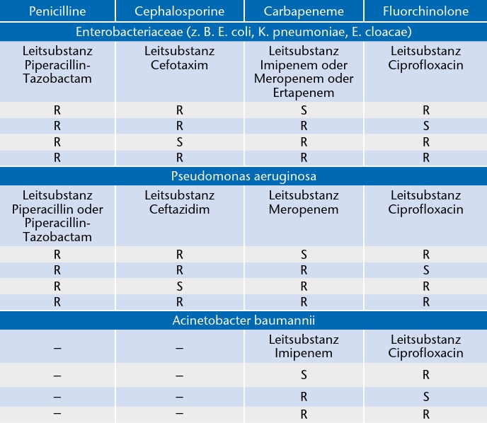 Eine kürzlich veröffentlichte Definition multiresistenter gramnegativer Erreger der Kommission für Krankenhaushygiene und Infektionsprävention (KRINKO) basiert für Enterobacteriaceae (u. a. Escherichia coli, Klebsiella pneumoniae und Enterobacter cloacae), Pseudomonas aeruginosa und Acinetobacter baumannii auf der Bewertung von vier antibiotischen Leitsubstanzen. Für diese Bewertung werden vier bakterizid wirkende Antibiotikagruppen herangezogen: Penicilline, Cephalosporine, Carbapeneme und Fluorchinolone. Eine Multiresistenz liegt vor, wenn nur noch eine Stellvertretersubstanz (3MRGN) oder keine (4MRGN) sensibel getestet wird 22 (Tab. 1). Die Definition gilt jedoch nicht für seltene gramnegative Erreger, z. B. Stenotrophomonas maltophilia.