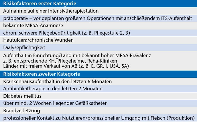 Um das Screening möglichst effektiv einzusetzen, hat die Kommission für Krankenhaushygiene und Infektionsprävention Risikofaktoren beziehungsweise Patientengruppen definiert, bei denen ein Aufnahmescreening erfolgen sollte (Tab. 2). Wird das Aufnahmescreening auf diese Patientengruppen beschränkt, kann trotz reduzierten Untersuchungsumfangs die Mehrzahl der MRSA-Patienten identifiziert werden. Es werden Risikofaktoren der ersten und der zweiten Kategorie unterschieden. Treffen ein Risikofaktor der ersten oder zwei Risikofaktoren der zweiten Kategorie zu, gilt die Empfehlung zum aktiven Screening 29.