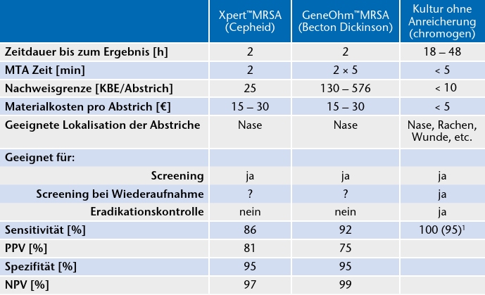 Wird das Aufnahmescreening auf Risikopatienten beschränkt, kann trotz reduzierten Untersuchungsumfangs die Mehrzahl der MRSA-Patienten identifiziert werden. Hohe Screening-Kosten, insbesondere bei der Verwendung von Schnelltests, können somit in einer gesunden Kosten-Nutzen-Relation gehalten werden (Tab. 3).