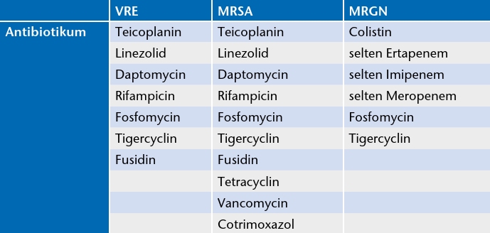 Bei Infektionen mit multiresistenten Erregern ist die Antibiotikagabe in der Therapie abhängig vom Keim und vom entsprechenden Resistogramm, welches eine Aussage über die Antibiotikaresistenz der Erreger erlaubt 44. Die Antibiotikatherapie sollte möglichst aufgrund eines vorliegenden Resistogramms verordnet werden. Die wenigen meist sensibel getesteten Antibiotika, sog. Reserveantibiotika, gegen die wichtigsten multiresistenten Erreger sind in Tabelle 4 dargestellt.