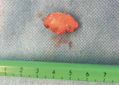 Im operativen Setting der Verfasserin trägt der Operateur stets eine Lupenbrille mit Stirnlampe zur besseren Identifizierung der Nervengefäßbündel und der Lymphknoten. Die axilläre Faszie, die das subkutane Fettgewebe vom axillären Fettgewebe anatomisch trennt, wird dann inzidiert und stumpf gespalten. Das axilläre Fettgewebe unterscheidet sich hinsichtlich der helleren Gelbfärbung und der Größe der Fettläppchen deutlich vom subkutanen Fettgewebe. Der Sentinellymphknoten wird erneut mit der Gammasonde geortet; ein entsprechender Tastbefund weist den Weg zum Ziellymphknoten (Abb. 5). Dieser wird angeklemmt, unter Koagulation der feinen zuführenden Blut- und Lymphgefäße mit der bipolaren Pinzette freipräpariert und entfernt (Abb. 6 u. 7).