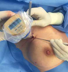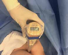 Bei der Entnahme eines Sentinellymphknotens sollte die Hautinzision in den Hautspaltlinien direkt über der Hautmarkierung erfolgen. Vorher wird mit der sterilen Gammasonde die Lage nochmals überprüft (Abb. 3 u. 4). Die Gammasonde ortet sowohl in Form von angezeigten Counts als auch akustisch – als schnelles Ticken – den markierten Lymphknoten.