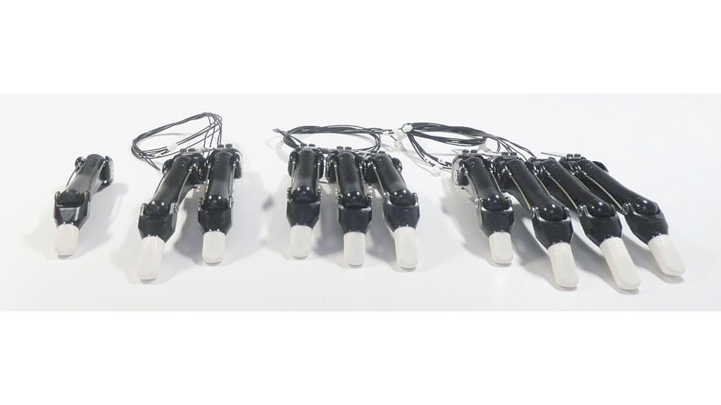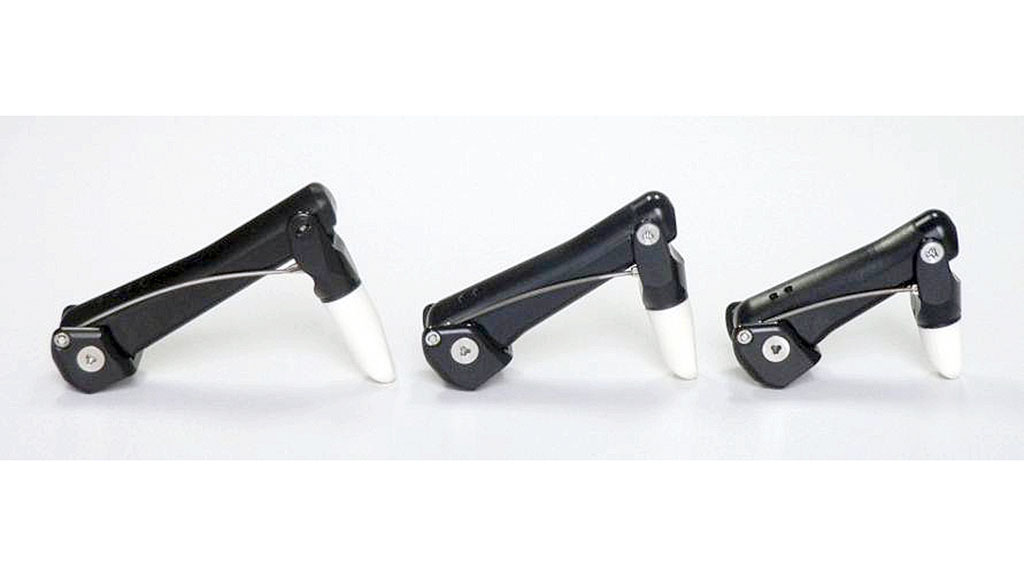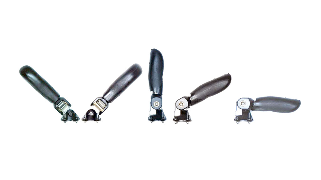 Die Einzelfingerprothesen werden in drei unterschiedlichen Längen, mit der Größenbezeichnung VS‑L, VS‑M und VS‑S, hergestellt (Abb. 3). Das Grundglied ist weitgehend gleich. Der Abstand zwischen der Montagefläche und der ersten beweglichen Achse beträgt hier 8 mm. Die im Mittelfingerbereich 66 mm langen VS-L-Finger werden bei gleicher Motorisierung durch die mit 60 mm wesentlich kürzeren VS‑M Finger abgelöst. Der mit 53 mm kürzeste Finger VS‑S hat eine etwas schwächere Motorisierung, ist jedoch für besonders kurze Versorgungen geeignet. Das 12 mm lange distale Fingerglied kann über auswechselbare Fingerspitzen zwischen 10 mm bis 25 mm in 5 mm Abstufungen verlängert werden. Ein VS-L-Finger mit einer 20 mm langen Fingerspitze hat damit eine Gesamtlänge von ca. 94 mm. Der kleinste VS-S-Finger hat mit einer 10 mm Fingerspitze eine Gesamtlänge von ca. 70 mm.