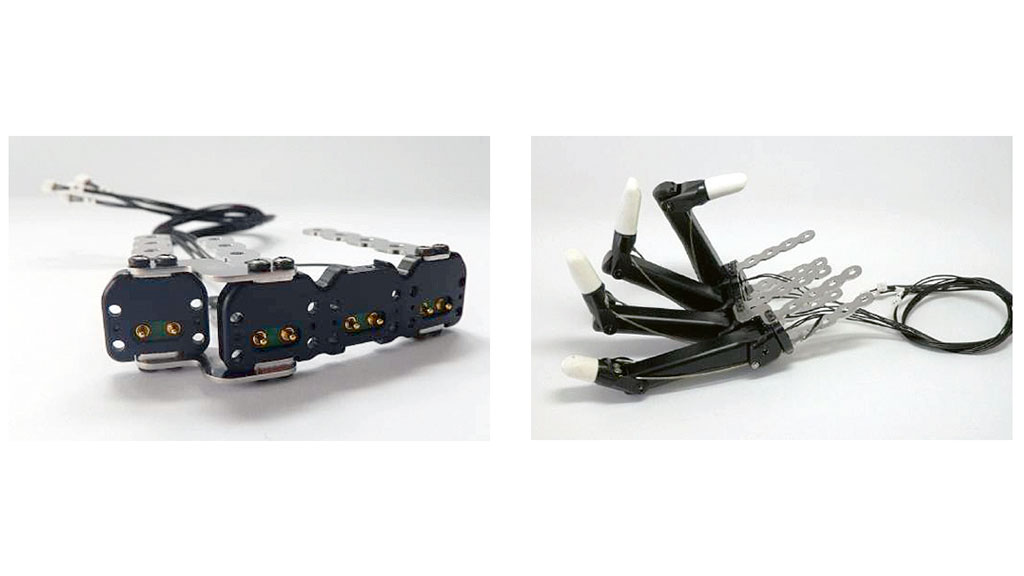 Zum Betrieb der Prothesenfinger müssen verschiedene Komponenten in den Prothesenschaft integriert werden. Die Einzelfinger sind kabellos über Federkontakte mit dem Rahmen verbunden, dieser wiederum über Einzellitzen mit der Motorsteuerung. Die Steuerung besitzt je nach Ausführung zwischen 4 und 6 Steckplätze für aktive Fingerprothesen und einen Daumen mit bis zu 2 aktiven Bewegungsachsen. Über 2 Ports können unterschiedliche Sensoren angeschlossen werden und über einen weiteren Steckplatz die Spannungsversorgung. Hier kommen in der Regel prismatische LiPo-Zellen zum Einsatz mit einer Gesamtspannung von 8,4 V und Kapazitäten von 750 mAh bis 2000 mAh. Die Akku-Zellen werden über einen Magnetstecker geladen, an dem sich auch der Ein/Aus-Schalter des Systems befindet. Die Steuerungselektronik der Prothese kann je nach Controllertyp über eine Kabelverbindung oder eine Bluetooth-Verbindung mit einem PC verbunden werden, um patientenspezifische Einstellungen vorzunehmen. Ein 2‑Finger-System ist in Abbildung 10 dargestellt.