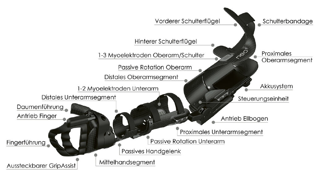 Die Antriebseinheit des Ellbogens und die dorsal positionierte Steuerungselektronik sind fest mit dem dis-talen Oberarmsegment verbunden. Das aktive Ellbogengelenk verbindet das distale Oberarm- mit dem proximalen Unterarmsegment. Auch der Unterarm ist in zwei Segmente eingeteilt. Beide Unterarmsegmente sind um die Unterarmachse rotatorisch über ein Bogengleitlager miteinander schwenkbar verknüpft. Das passive Handgelenk gestattet eine stufenlose Positionierung der Hand bei einstellbarer Friktion. Das Mittelhandsegment ist ulnarseitig mit dem passiven Handgelenk verbunden, zusammen mit der Daumenführung fixiert es Hand und Daumen in einer für das Greifen optimalen Stellung. Dorsalseitig des Mittelhandsegments ist der abnehmbare GripAssist, bestehend aus Fingerführung und Antriebseinheit, positioniert, welcher die Langfinger myoelektrisch zum opponierten Daumen bewegt.