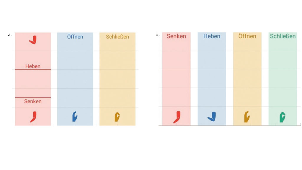 Mode 2 bis 4: 2‑Elektroden-Steuerung. Ellbogen und Hand werden mit zwei Elektroden in einer Ebene (Oberarm oder Unterarm) sequenziell oder beiden Ebenen (Oberarm und Unterarm) simultan gesteuert, das Umschalten zwischen den Gelenken erfolgt mit einem Trigger (Abb. 6).