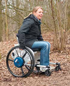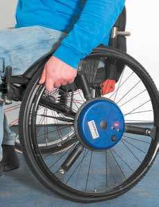 Für erste Untersuchungen zum Leistungsbedarf von Rollstuhlfahrern auf bestimmten Strecken wurde ein bereits bestehendes Messsystem aus dem Klinikbereich genutzt. Das „Smart-Wheel” der Firma Out-Front (Mesa, Arizona, USA) kann Kräfte dreidimensional aufnehmen und erlaubt somit detaillierte Rückschlüsse auf die Leistungsfähigkeit und Greifart des Rollstuhlnutzers. Dieses System wird im Rahmen von Bewegungsanalysen bei Rollstuhlnutzern im Klinikbereich verwendet (Abb. 2). Die Kräfte werden mit Dehnungsmessstreifen ermittelt und mit Hilfe eines internen Prozessors in Leistungswerte umgerechnet. In Zusammenarbeit mit Therapeuten lernen Menschen, die einen Rollstuhl benötigen, den effektiven Umgang mit dem Hilfsmittel Rollstuhl. Im Kompetenzzentrum für Bewegungsanalyse KfB wurden mit dem SmartWheel erste Untersuchungen mit einer Probandengruppe durchgeführt. Hier wurde die individuelle Leistung von Rollstuhlnutzern im Indoor-Bereich auf ebenen Streckenabschnitten ermittelt.