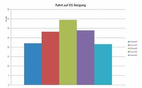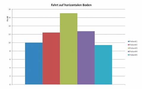 Nach der Durchführung von Testfahrten auf ebenen Streckenabschnitten (Abb. 3) mit mehreren Probanden wurden die Rahmenparameter für das Teutowheel ermittelt. Durch Untersuchungen auf einer Strecke mit 5 % Steigung (Abb. 4) konnte der Leistungsbedarf der Probandengruppe auch für nichthorizontale Untergründe ermittelt werden. Hierbei stieg der Leistungsbedarf der Probanden auf mehr als den doppelten Wert im Vergleich zu einer horizontalen Strecke.