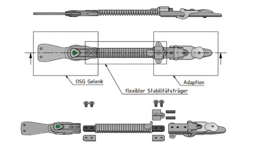 Der dynamische Stabilitätsträger hat das Ziel, die frontale Bewegung des Fußes in die physiologische Bewegungsrichtung freizugeben und die pathologische zu sperren (Abb. 2). Dies soll durch ein anisotropes Biegeverhalten erreicht werden, welches durch den flexiblen Carbonstab mit den dazugehörigen an der Innenseite eingekerbten Bauteilen umgesetzt wird (Abb. 3). Die anisotrope Flexibilität wird durch die Aluminiumbauteile erreicht, die auf den Carbonstab geschoben und dort passiv fixiert werden (Abb. 2). Bei einem Anwendergewicht unter 30 kg wurde ein 3 mm dicker Carbonstab und bei über 30 kg ein 4 mm dicker Carbonstab verwendet. Um eine Flexibilität in die gewünschte Richtung zu ermöglichen, sind die Aluminiumbauteile an der Innenseite so angeschliffen, dass eine Biegung zum Körper hin möglich ist. Auf der Außenseite sind diese hingegen auf Stoß gearbeitet, sodass eine Biegung des Carbonstabes in diese Richtung blockiert wird (Abb. 4). Des Weiteren kann der Widerstand in die pathologische Bewegungsrichtung erhöht werden. Der proximal direkt über den Klötzen angebrachte Anpresskopf (Abb. 3, 4) ermöglicht durch einen Schraubenmechanismus, den Anpressdruck zwischen den Aluminiumklötzen zu erhöhen und somit den Widerstand, der sich durch die vorhandenen Fertigungstoleranzen zu gering oder zu spät aufbauen kann, früher einsetzen zu lassen und zu verstärken. Somit wird der Biegewiderstand in die pathologische Richtung erhöht, es entsteht jedoch auch eine Vorspannung in die physiologische Bewegungsrichtung. Je nach Indikationsstellung wird der DS lateral bei einem Spitzknickfuß oder medial bei einem Spitzklumpfuß mit den Einschnitten zum Körper gerichtet, eingebaut. Somit wirken die Drehmomente hauptsächlich in die freigegebene Richtung, da sich die größte Fläche des Fußes medial bei einem Spitzknickfuß oder lateral bei einem Spitzklumpfuß befindet. Die auftretenden Drehmomente in die pathologische Richtung sollen durch die an der Außenseite auf Stoß gearbeiteten Aluminiumbauteile aufgefangen und der Fuß somit in dieser Bewegung limitiert werden. Der DS wird mit einem OSG-Gelenk und einer distalen Adaption als einziges Verbindungsstück zwischen der Unterhülse und dem Fußteil an einer unilateral geführten Unterschenkelorthese mit Ringfassung verbaut. Zum Zeitpunkt der Anfertigung dieser Arbeit liegt das zugelassene Körpergewicht zur Verwendung eines DS bei minimal 14 kg und maximal 56 kg.