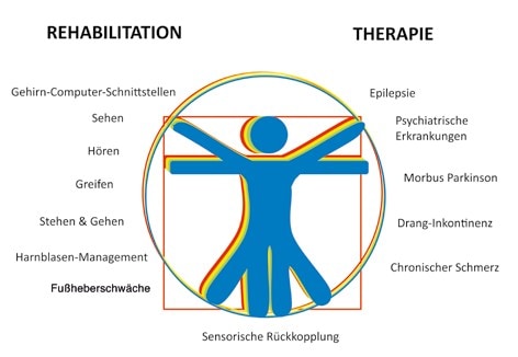 Elektrisch aktive Implantate im medizinischen Einsatz helfen bei der Diagnose von Erkrankungen, indem mit ihnen Signale aufgenommen und Ereignisse erkannt werden. Sie modulieren die Nervenaktivität und lindern dadurch Symptome von Erkrankungen. In der Rehabilitation ersetzen sie funktionell die verloren gegangenen Funktionen 3. Im Bereich der Forschung wurden alle erdenklichen Anwendungen bereits untersucht und in Pilotstudien auf den Menschen übertragen (siehe Abb. 1). Wiederherstellung von Seh- und Hörsinn, Greifen, Stehen und Gehen, Zwerchfellstimulation zur Atmung, Stimulation des um das Herz gewickelten Schultermuskels zur Herzkraftunterstützung, Aktivierung des Fußes nach Schlaganfall (Fallfuß) und Harnblasenmanagement sind in der Rehabilitation bereits untersucht worden. Elektrische Stimulation des Rückenmarks zur Verringerung chronischen Schmerzes und zur Behandlung von Dranginkontinenz, Tiefenhirnstimulation bei Morbus Parkinson, aber auch bei schwersten psychiatrischen Erkrankungen, Gehirn- und Vagusnervstimulation bei Epilepsie stellen Optionen zu medikamentösen Therapien bereit.
