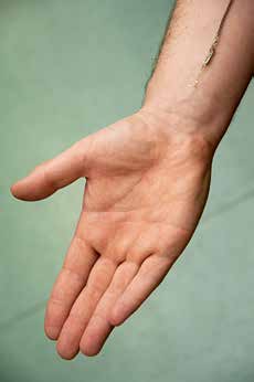 Eine Frage, der die Autoren im Rahmen europäischer Verbundforschung im 7. Rahmenprogramm nachgehen, lautet, ob ein Patient durch Elektrostimulation der noch im Amputationsstumpf vorhandenen Nerven intuitiv sensorische Informationen über Griffkraft und Objektform wahrnehmen und zur Steuerung von Handprothesen einsetzen kann. Inwieweit diese Stimulation auch den Phantomschmerz beeinflussen kann, ist ein weiterer Punkt der geplanten klinischen Studien. Innerhalb von fünf Jahren wurde eine haarfeine Elektrode entwickelt und präklinisch getestet 10, mit der Faserbündel im Nerven selektiv stimuliert werden können (Abb. 4). Je zwei Elektroden mit jeweils 14 Kontaktpunkten wurden in einer humanen Pilotstudie an einem Patienten 11 12 in den N. ulnaris und den N. medianus im Arm implantiert. In einem aufwendigen Screeningverfahren wurden diejenigen Kontaktpunkte auf den Elektroden identifiziert, bei denen der Patient ein Berührungsgefühl von den Innenseiten des Daumens, des Zeigefingers und des kleinen Fingers berichtete. Diese Kontaktpunkte der Elektroden stellten nun den Rückmeldekanal dar, über den Informationen von Kontakt und Kraft aus Sensoren der Handprothese als elektrische Stimulationssignale in die Nerven eingeleitet und an den Patienten zurückgemeldet wurden. Durch diese Art der Rückmeldung gelang es dem Patienten nahezu intuitiv, innerhalb weniger Minuten die Informationen beim Greifen nutzbar zu machen. Er konnte drei unterschiedliche Formen (Kugel, Zylinder, Würfel) sowie drei Härtegrade (einen Stapel Baumwollflies = weich, einen Einwegtrinkbecher aus Kunststoff = mittel, ein Glas = hart) unterscheiden. Wahrnehmung und Rückmeldung blieben zuverlässig über den Implantationszeitraum von 30 Tagen; die Elektroden arbeiteten reproduzierbar im sicheren Bereich. Die Studie war aufgrund (sicherheits-)technischer Gründe und regulatorischer Rahmenbedingungen des Medizinproduktegesetzes auf 30 Tage begrenzt.
