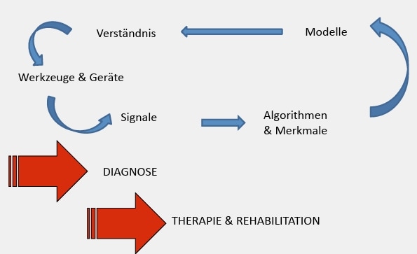 Neurotechnische Implantate eröffnen neue Möglichkeiten in Diagnostik, Therapie und Rehabilitation. Medizinisches Expertenwissen ist noch notwendig, um die Systeme patientenspezifisch einzustellen, gerade wenn eine Regelschleife geschlossen werden soll. Die neuen Implantate sind allerdings auch Werkzeuge, mit denen Signale aufgenommen und neue Algorithmen eingesetzt werden können, um Modelle zu überprüfen, Wissen über den Körper und die Änderungen bei Erkrankungen zu gewinnen und besser zu verstehen und damit neue Therapien und Implantate zu entwickeln (Abb. 5). In diesem Fall scheint es sich also für Ärzte und Techniker zu lohnen, im Kreis zu gehen, um Fortschritte zu erzielen und Patienten besser versorgen zu können.