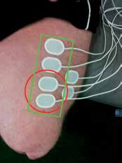 Es wurden vorausgehende Tests durchgeführt, um die passende Oberflächenelektrodenanordnung zu ermitteln. Ein Biosignalverstärker sowie ein Aufzeichnungssystem von Kine ehf wurden für die Erfassung des Oberflächen-EMG-Signals verwendet. Diese Verstärker haben eine Abtastfrequenz von 1600 Hz und können drahtlos EMG-Daten an einen Computer übermitteln. Es zeigte sich, dass die Passform des Schafts die Muskelaktivität des Stumpfes beeinflusst, und es war daher äußerst wichtig, denselben Schaft für die Erfassung der IMES und der Oberflächen-EMGs zu verwenden. Die Verstärker waren zu groß, um innerhalb des IMES-Schafts verwendet zu werden, und es wurden daher weiche Hydrogel-Elektroden auf der Haut angebracht und die Verbindungsdrähte proximal über den Schaftrand zu den auf dem Rücken des Probanden befindlichen Biosignalverstärkern geführt. Um die ideale Position für die Elektroden zu bestimmen, wurde der Stumpf während der Kontraktionen abgetastet und der Bereich von größtem Interesse ermittelt und gekennzeichnet. Es wurden im Anschluss iterative Messungen vorgenommen, um die Stelle mit der maximalen Signalstärke ausfindig zu machen. An der Stelle mit der maximalen Signalstärke sowie um den Bereich der durch Liner und Schaft zu erwartenden Verschiebung herum, d. h. nach proximal, wurden anschließend Elektroden platziert (Abb. 5).