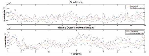 Die mittlere Amplitude der Signale war bei allen Belastungsübungen (z. B. Gehen, Herabgehen von Treppen sowie Aufstehen und Hinsetzen) bei beiden Muskeln höher und zeigte im Vergleich mit dem Oberflächen-EMG-Signal eine niedrigere Variabilität beim IMES-Signal. Dies ist in Abbildung 6 dargestellt, welche die mittlere und die Standardabweichung der IMES- und der Oberflächen-EMG-Signale zeigt, die beim Herabgehen einer Treppe aufgezeichnet wurden. Auf dieser Abbildung ist zu sehen, dass die hintere Oberschenkelmuskulatur beim Beugen des Knies und vor der anschließenden Schwungphasenextension aktiviert wird. Während des Gehens konnte ein ausgeprägtes Muskelaktivitätsmuster beim oberschenkelamputierten Probanden aufgezeichnet werden. Der oberschenkelamputierte Anwender hatte jedoch Schwierigkeiten bei der Durchführung einer willkürlichen Kontraktion einzelner Muskeln, wie das Oberflächen-EMG und die IMES-Messungen zeigten.