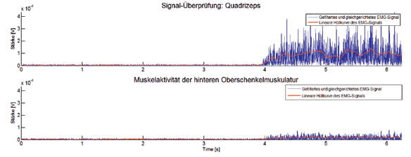 Ein Beispiel für die Prüfung des Oberflächen-EMG-Signals ist in Abbildung 7 zu sehen, wo der Proband darum gebeten wurde, 5 Sekunden lang zu entspannen und dann seinen Quadrizeps anzuspannen. Das Kontraktionssignal des untersuchten Muskels war immer stärker als die Signale der mitkontrahierenden Muskeln, die daher bei einem Kontrollschema mit einfachem Schwellenwert außer Acht gelassen werden können. Beim unterschenkelamputierten Probanden lagen keinerlei ausgeprägte Muskelaktivitätsmuster vor, die beim Gehen auf ebener Fläche mit einem der beiden Setups hätten erfasst werden können. Als der Proband jedoch dazu aufgefordert wurde, an das Heben seiner Zehen während des Gehens zu denken, konnte eine deutliche Aktivität festgestellt werden.