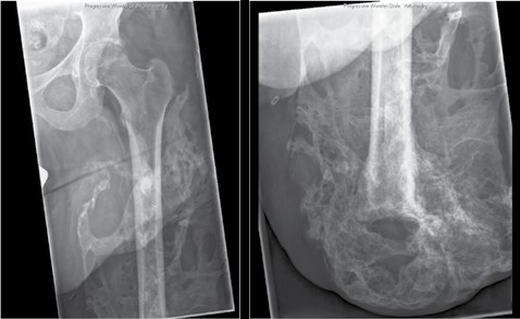 Knochenkanten und Exostosen, die zu nicht prothesenfähigen Stümpfen führen, können einfach reseziert und geglättet werden, teilweise in Kombination mit weichteilverbessernden Maßnahmen. Heterotope Ossifikationen stellen ein größeres Problem dar (Abb. 4). Sie treten bei ca. 23 % der zivilen Patienten nach Amputationen auf, unabhängig von der Ätiologie 9, und bei ca. 63 % der kriegsbedingten Amputationen 10. Bei den kriegsbedingten Amputationen stellten Explosionsverletzungen und Amputationen direkt im Bereich der Verletzung einen Risikofaktor für die Entstehung heterotoper Ossifikationen dar 11. Ferner sind heterotope Ossifikationen häufig mit Rückenmarks- und Hirnverletzungen assoziiert. Die Revisionsoperationen sind häufig nicht nur groß und aufwendig, sondern auch mit hohen Komplikationsraten behaftet. Als Komplikationen treten beispielsweise Blutungen sowie Wundheilungsstörungen auf. Erfreulicherweise können die meisten Komplikationen gut beherrscht werden, und die Patienten erlangen weitestgehende Schmerzfreiheit und prothesenfähige Stümpfe. Patienten, die trotz der Revisionsoperation keine prothesenfähigen Stümpfe erlangen, bedingt z. B. durch Reossifikationen, können auch der Osseointegration zugeführt werden. Auf die Osseointegration wird in diesem Beitrag ebenfalls nicht weiter eingegangen, da sie bereits in einem vorausgegangenen Beitrag ausführlich behandelt wurde 12.