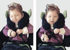 Die Unterstützungsform ist aus Plastazote geformt und im Nackenbereich mit einer starren Metallleiste, in den Schenkeln mit formbarem Aluminiumblech verstärkt. Die Aluminiumschenkel sind mit der Metallleiste per Gelenk verbunden, damit die Unterstützungsform für den Transfer auseinandergeklappt werden kann. An der Metallleiste im Nackenbereich und an den Schenkelenden sind Gurtbänder angebracht, die die richtige Position und Wirkung der Unterstützungsform sicherstellen sollen. Da diese Kopfunterstützung auf der Schulter aufliegt und ihre Position durch die Verbindung zur Kopfstütze und gekreuzt zu Sicherheits- oder Beckengurten erhalten bleibt, wird eine interessengesteuerte Kopfbewegung, vor allem eine Rotation, bei gut aufgerichtetem Kopf ermöglicht. Das Mädchen kann mit deutlich weniger Neigung der gesamten Sitzeinheit aufgerichteter sitzen und hat so bessere Voraussetzungen für Aktivität und Kommunikation. Die Kopfhaltung ist auch für den Schluckvorgang günstiger (Abb. 12).