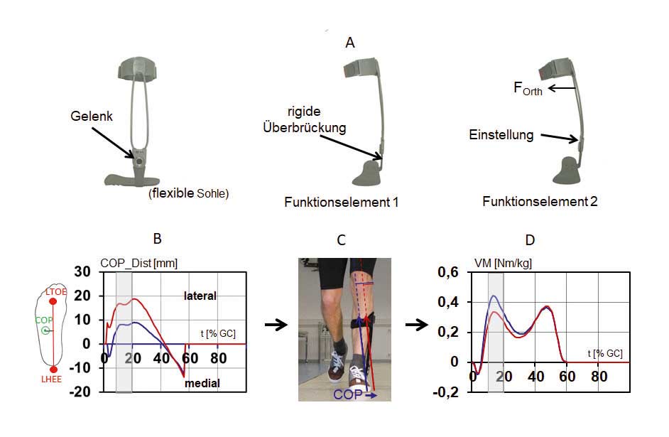 Die Resultate der biomechanischen Wirkung von RE lieferten Diskussionsstoff bezüglich der individuell differenten Effekte. Ein plausibler Erklärungsansatz wurde bereits vor ca. 15 Jahren in einer Prinzipstudie überprüft und führte dazu, eine AFO zur Knieentlastung einzusetzen 60. Der Erklärungsansatz bezüglich der unzuverlässigen Wirkung von RE bestand darin, dass insbesondere bei Instabilitäten im Bereich des unteren und oberen Sprunggelenks (USG und OSG) die Applizierung einer Außenranderhöhung in der frühen Standphase mit einer verstärkten Eversion kompensiert wird und sich somit keine Lateralverschiebung des COP und keine VM-Reduktion einstellt. Um diese unerwünschte Kompensation auszuschließen, wurde in der Prinzipstudie eine AFO mit einem lateralen Bügel getestet, der USG und OSG rigide überbrückt. Im Vergleich der Interventionen RE einerseits und RE + AFO andererseits bestätigte sich, dass sich aus der rigiden frontalen Überbrückung von USG und OSG eine signifikante Lateralverschiebung des COP und eine VM-Reduktion ergibt 61. Aus Sicht der Gelenkkinematik geht dieser Effekt mit hoher Wahrscheinlichkeit mit einer deutlichen Verringerung der initialen Eversion einher. Dieses Ergebnis führte zu der in Abbildung 4 dargestellten Orthesenvariante, die im Artikel von Drewitz et al. 62 im Detail vorgestellt wurde. Neben der rigiden frontalen Überbrückung der Sprunggelenke ist der Orthesenbügel individuell einstellbar, womit die Kraftwirkung am Unterschenkel variiert werden kann. An dieser Stelle muss allerdings darauf hingewiesen werden, dass die Modulation dieser Krafteinleitung nur ein sekundärer Wirkeffekt ist: Die gelenkentlastende Wirkung resultiert in hohem Maße aus der rigiden frontalen Knöchelüberbrückung. Im Gegensatz zu den mit RE erzielbaren Effekten führt dies zuverlässig zur Lateralverschiebung des COP und zur signifikanten Reduktion der VM-Bewertungsparameter (Abb. 4B–D). Dieser klare mechanische Effekt ist mittlerweile in einer Vielzahl von Studien mit gesunden Probanden und Gonarthrose-Patienten nachgewiesen worden (Tab. 1). Anhand der Ergebnisse dieser Untersuchungen kann abgeschätzt werden, dass das spezifische Prinzip der AFO den ersten „peak“ des VM im Mittel um ca. 15 bis 20 % reduziert.