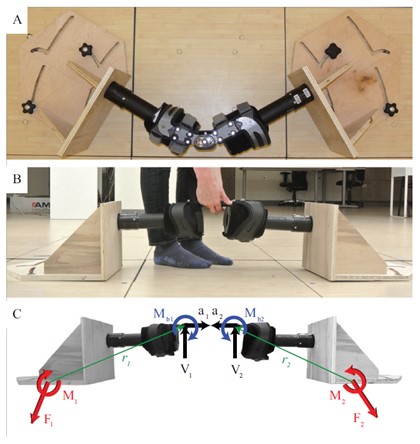 Zur Bestimmung der Größe der kompensatorischen Wirkung sind in der internationalen Literatur differente Ansätze zu finden. Bereits im Jahr 2000 stellten Self und Mitarbeiter 37 die Nutzung einfacher Drucksensoren vor. Dabei wurde die Druckentwicklung zwischen Orthesenpelotte und lateralem Femurkondylus während der Standphase erfasst, wodurch auf das OM geschlossen werden konnte. In der oft zitierten Studie von Pollo et al. 38 wurde das OM aus den Daten von in der Orthese applizierten Kraftsensoren berechnet; eine mit einem Momentensensor instrumentierte Orthese nutzten Fantini et al. 39. Ohne eine instrumentierende Veränderung der Orthese kommt ein spezielles Kalibrierverfahren aus, das beispielsweise in den Studien von Schmalz et al. 40 und Brandon et al. 41 vorgestellt wurde (Abb. 3). Grundidee ist hier, mit einem spezifischen Kalibriervorgang den Zusammenhang zwischen Orthesendeformation („Verbiegung“ der Orthesenschalen) und der dazu notwendigen Kraft (z. B. F2 in Abb. 2) zu bestimmen. Misst man nachfolgend bei realen Bewegungsabläufen mit bewegungsanalytischen Verfahren die natürlicherweise auftretende (in ihrer Stärke einstellbare) Verbiegung der Orthese, ist das OM ebenfalls berechenbar. Die Werte für das OM können bezüglich Messverfahren, Orthesentyp und individueller Einstellung variieren. Aus der Gesamtheit der differenten Studien kann jedoch geschätzt werden, dass das OM bei praxisrelevanten Einstellungen während des in der Standphase auftretenden ersten „peak“ des VM im Mittel etwa 15 % von diesem beträgt.
