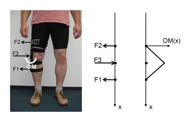 Mit dieser – meist einstellbaren – Krafteinleitung erzeugt die Orthese ein Valgusmoment, also ein Orthesenmoment (OM), das dem VM entgegenwirkt. Dadurch kompensiert die KO einen Teil des externen Moments; die auf das Kniegelenk wirkende Belastung wird zunächst zumindest um den Betrag des OM reduziert.