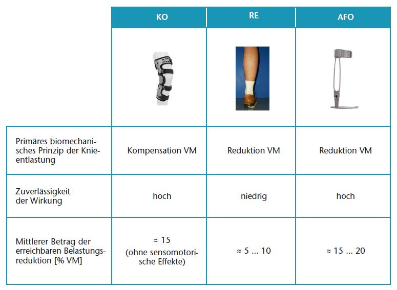 Die diskutierten biomechanischen Wirkmechanismen sind in Tabelle 2 vergleichend zusammengefasst. Der prinzipielle Unterschied zwischen der knieübergreifenden Orthese und den anderen beiden Orthesenarten besteht darin, dass die Kniebelastung mit der KO durch einen kompensatorischen Effekt reduziert wird, wohingegen AFO und RE durch eine direkte Reduktion des VM wirken. Die Zuverlässigkeit der Wirkung kann für KO und AFO als gleichwertig hoch und für RE als deutlich verringert angenommen werden.