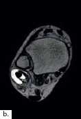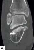 Die Diagnose einer OSG-Distorsion, die später als Grundlage einer adäquaten Therapie dient, ergibt sich aus der Kombination von Befunden verschiedener diagnostischer Ebenen (Anamnese, klinische Untersuchung, bildgebende Diagnostik). Die Erstdiagnostik nach dem Unfall beinhaltet Röntgenaufnahmen des OSG in zwei Ebenen. Im Verlauf und bei persistierenden Beschwerden können MRT- (Abb. 2) oder CT-Aufnahmen angefertigt werden, um Begleitverletzungen wie osteochondrale Frakturen (Abb. 3a), Syndesmosenverletzung oder Peronealsehnenaffektion (Abb. 3b) nachzuweisen.