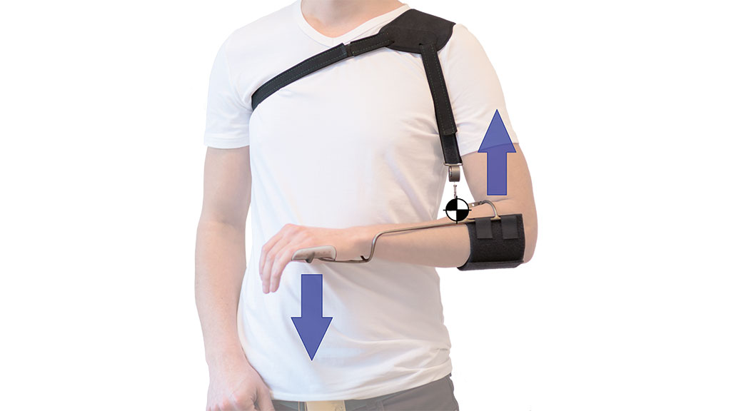 Die Wilmer Trageorthese wurde in den 1960er Jahren in den Niederlanden an der TU Delft für die Versorgung von Patienten mit lähmungsbedingter (Sub-)Luxation des Schultergelenks entwickelt. Sie besteht aus einer Schulterbandage, an welcher eine Unterarmlagerung aufgehängt wird. Das Wirkprinzip lässt sich anhand einer Wippe beschreiben. Der Punkt, an welchem die Unterarmlagerung aufgehängt wird, ist der Drehpunkt. Unterarm und Hand haben einen langen Hebelarm und werden von ihrem Gewicht nach unten gezogen. Dadurch werden auf der anderen Seite des Drehpunktes Ellenbogen und Oberarm, welche einen kurzen Hebelarm haben, angehoben. Somit wird der Humeruskopf in der Pfanne zentriert und die Subluxation verhindert6 (Abb. 3).