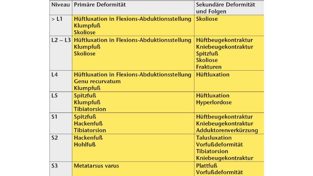 Werden das Lähmungsniveau und die damit entstehenden Kontrakturen bestimmt, sollte bei Kindern mit der erforderlichen präventiven Versorgung begonnen und ein Behandlungsplan aufgestellt werden. Die in Tabelle 2 benannten Deformitäten ergeben sich aus der motorischen Lähmung der Kinder. Diesen zu erwartenden Deformitäten muss daher noch, bevor sie sich ausbilden, über Lagerungs‑, Korrektur- und Funktionsorthesen sowie Physiotherapie entgegengewirkt werden.