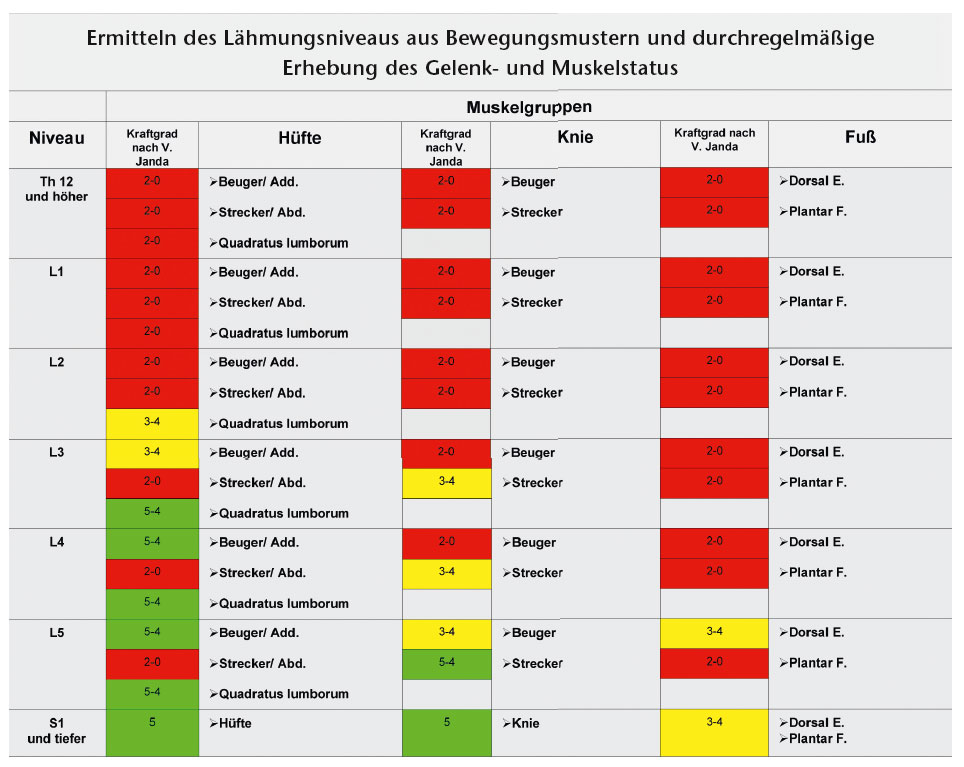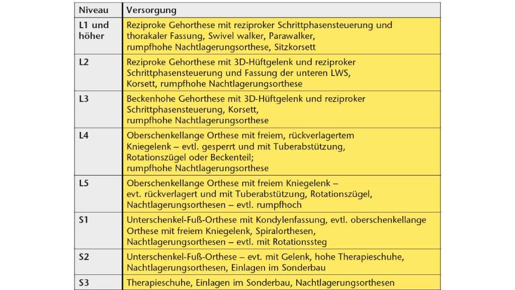 Die orthopädietechnische Versorgung orientiert sich am klinisch ermittelten Lähmungsniveau des Patienten. Dieses stellt sich in vielen Fällen auch mit nicht seitengleichem, also asymmetrischem, Lähmungsbild dar. Hierzu wird die Muskulatur auf ihre erhaltene Kraft und Funktion untersucht und entsprechend eingeteilt. Die Einstufung des Kraftgrads und die daraus resultierenden Muskelfunktionen und Möglichkeiten erfolgt nach Janda (siehe auch Tab. 1). Ist ein Funktionstest nicht durchführbar, wird das Läsionsniveau über die Bewegungsmöglichkeiten des Kindes definiert und dokumentiert.