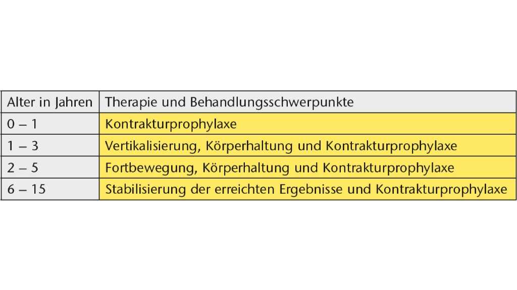 Die therapeutische Zielsetzung richtet sich im Wesentlichen, bezogen auf das ermittelte Lähmungsniveau, auf die Vermeidung der zu erwartenden Kontrakturen. Ferner sollen die Kinder bei der Vertikalisierung altersgerecht unterstützt werden und im Gebrauch, dem Handling und der Funktion der Orthesen geschult werden. Dies ist erforderlich, um die Orthesen frühzeitig in das Körperschema zu integrieren und so eine maximale Funktionalität und einen bestmöglichen Nutzen der Hilfsmittel zu gewährleisten (siehe Tab. 3).