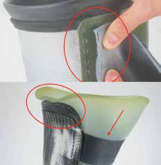 Je dünner der Innenschaft angefertigt wird, umso flexibler wird er. Hier muss die Belastung durch das Anwendergewicht und die Aktivität des Anwenders der Haltbarkeit gegenübergestellt werden. Dem typischen Kaltfluss der flexiblen thermoplastischen Schaftmaterialien muss entgegengewirkt werden, da es ansonsten zu einem vorzeitigen und zu schnellen Verschleiß des Innenschaftes kommt. Der Container wird übe den flexiblen Innenschaft angefertigt. Hierbei werden rigide und tragende Carbonkonstruktionen im Laminierverfahren hergestellt. Der Container muss die wirkenden Kräfte aufnehmen und übertragen können. Zur bestmöglichen Nutzung der flexiblen Eigenschaften des Innenschaftes wird der dorsale Bereich des Containers so tief wie möglich gekürzt. Zur Vermeidung des bereits beschriebenen Kaltflusses thermoplastisch flexibler Innenschäfte können Gurtbänder oder Textilien diesen im Container freigeschnittenen Ausschnitt sichern und einem Auswalken des flexiblen Innenschaftes entgegenwirken. Für eine zuverlässige Abdichtung muss die Dichtmanschette auf dem Innenschaft genügend Dichtfläche zur Verfügung stellen. Bei Sealsystemen sollte ein Zwei-Wege-Ventil zum Einsatz kommen, sodass auch das Aussteigen erleichtert wird (Abb. 5).