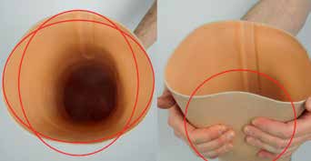 Da alle vorkonfektionierten Liner einen runden Querschnitt aufweisen, eignen sich diese für den Knieexartikulationsstumpf nicht. Hier bieten individuelle Liner die besten Voraussetzungen für ein leistungsfähiges und formkongruentes Interface zwischen Stumpf und Innenschaft. Unnötig dicke Linerenden müssen vermieden werden. Ein dem Stumpf- und Knochenverlauf angepasster Querschnitt sorgt für optimale Passform in den lastübertragenden Bereichen 4. Die Berücksichtigung dieser konstruktiven Auswahlkriterien kann als Basis für den im Allgemeinen sehr aktiven Knieexamputierten gelten. In einigen Fällen können vorkonfektionierte Liner über Formungsmodelle im distalen Bereich geringfügig geweitet werden. Jedoch muss ein vollflächiger Kontakt im suprakondylären Bereich gegeben sein, um vor Kondensationsfeuchte im Liner zu schützen. Für diese Anwendung eignen sich Copolymer-(TPE-)Liner aufgrund ihrer thermoplastischen Eigenschaften. Liner bieten zudem den Vorteil, dass sie die Weichteile unter einer guten Vorkompression stabilisieren und einem Aufschieben des Gewebes beim Schafteintritt entgegenwirken, um einer möglichen Schaftrandproblematik vorzubeugen.