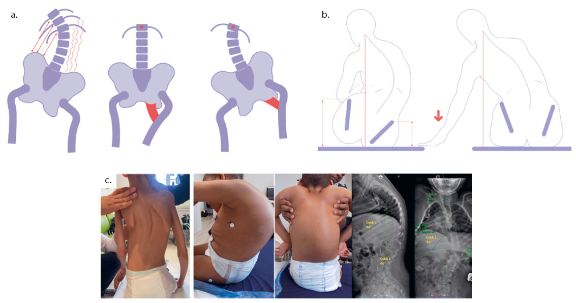 Die typischen Wirbelsäulenkrümmungen bei einer neuromuskulären Skoliose scheinen auf den ersten Blick den Krümmungsmustern idiopathischer Skoliosen zu ähneln. Fast immer sind neuromuskuläre Skoliosen mit einem Beckenschiefstand und/oder einer Hüftluxation und ‑kontraktion assoziiert15 16. Thorakolumbale Krümmungen bis tief ins Becken mit begleitendem Beckenschiefstand sind typisch bei neuromuskulären Wirbelsäulendeformitäten17. In einigen Fällen resultiert der Beckenschiefstand aus dem ungleichen Tonus der Muskulaturanteile, die Becken und Wirbelsäule verbinden. Dies wird als Beckenschiefstand „oberen Ursprungs“ bezeichnet18 (Abb. 1a).