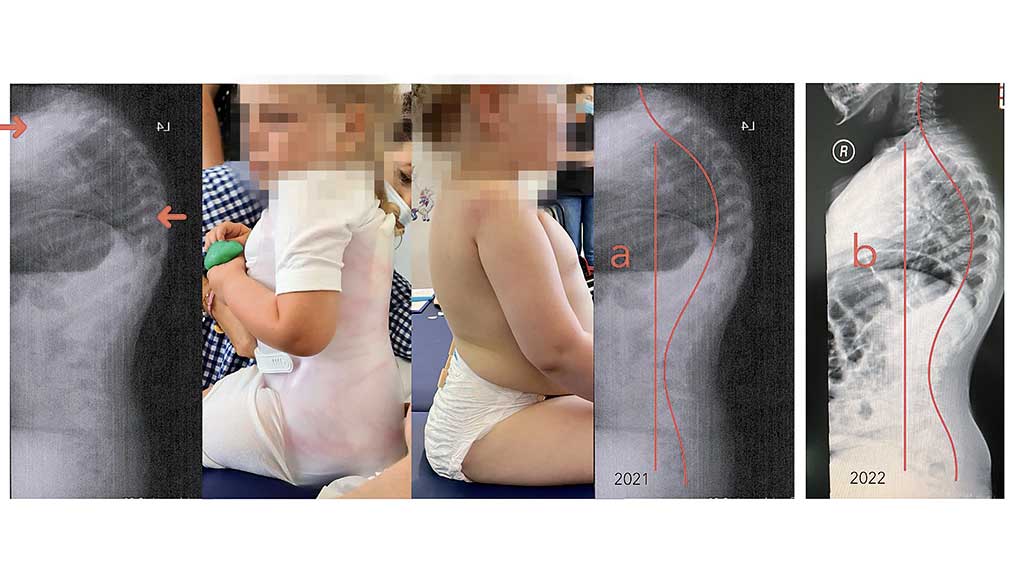 Das folgende Fallbeispiel demonstriert die Korrektur einer ausgeprägten thorakalen Kyphose bei einer SMA vom Typ 1 mit dem neuroBrace-System, das zwei sich überlagernde Dreipunktsysteme kombiniert (Abb. 10). Im Sitzen ist klinisch die sagittale Aufrichtung in der Orthese deutlich zu erkennen. Die radiologische Kontrolle bestätigt das klinische Bild. Die thorakale Inklination (Beschriftung a) ist im Kontrollröntgenbild (Beschriftung b) signifikant reduziert.