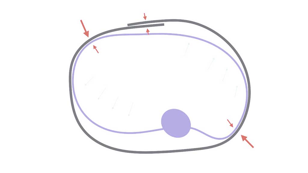 Aufgrund der zirkulär rumpfumfassenden, minimalistischen Konstruktion des neuroBrace-Systems mit ventraler Überlappung, die mit zwei Velcro-Gurten stufenlos verschlossen wird, stabilisiert/spreizt sich das System über die Anlagezonen. Im Transversalschnitt zeigt sich, wie durch die linke ventrolaterale und die rechte dorsolaterale Anlagezone, durch die ventrale Überlappung und durch den Kontakt mit dem Rumpf im Bereich des thorakalen Scheitelwirbels ein stabiles System erzeugt wird (Abb. 12). Die Korrektur/Retension erfolgt über das externe Kräftepaar der Anlagezonen der Orthese. Gleichzeitig werden auch alle weiteren angestrebten biomechanischen Funktionen (Erhalt der Atmung etc.) gewährleistet.