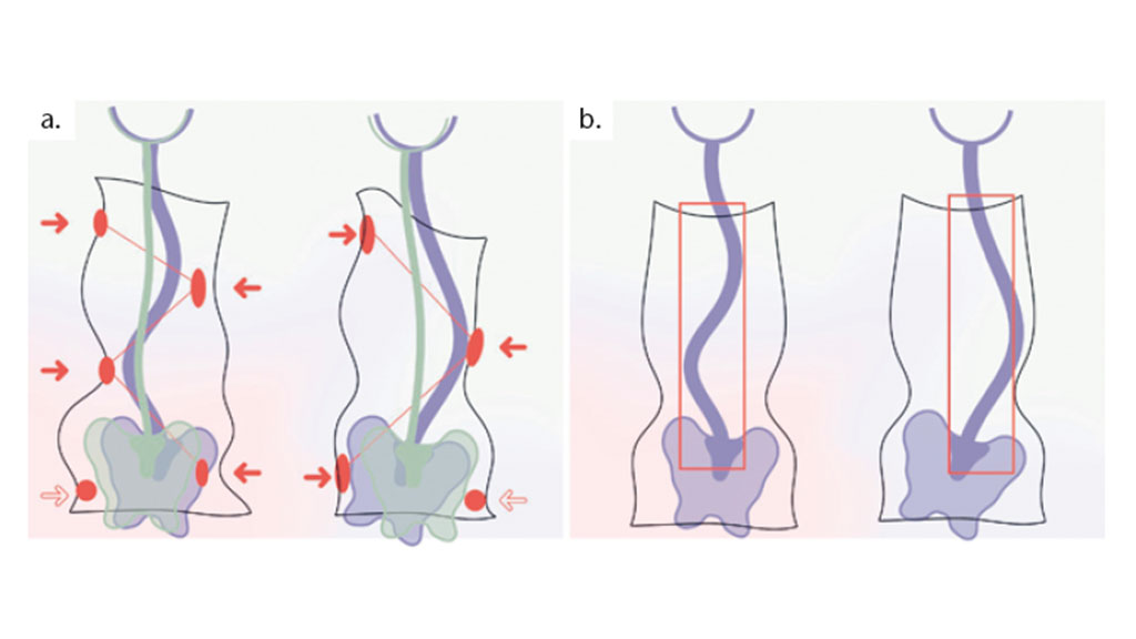 In der Regel sind einfache Dreipunktsysteme, bestehend aus Beckenfassung sowie dorsaler und kranial-ventraler Anstützung, für eine sagittale Aufrichtung ausreichend. Bei komplexeren und stark strukturellen Krümmungen, vor allem bei stark hyperlordotischen Abweichungen, sind Systeme erforderlich, die das sagittale Realignment überlagern. Das zusätzliche Dreipunktsystem erfasst den ventralen abdominalen Bereich, die Schulterregion im dorsal-kranialen Bereich und kaudal die im Bereich des Os sacrum oder der Glutealzone gelegenen Areale (Abb. 9b).