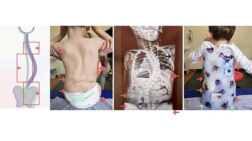 Die orthopädietechnische Behandlung neuromuskulärer Skoliosen kann aber prinzipiell – ebenso wie die Behandlung idiopathischer Skoliosen mit dem Chêneau-Brace/Korsett nach Rigo – basierend auf einem standardisierten System mit einem entsprechenden biomechanischen Konzept umgesetzt werden. Dafür müssen spezielle klinische und anthropometrische Daten sowie 3D- und röntgenologische Daten erfasst werden. Diese Daten werden auf eine Plattform übertragen und systematisch ausgewertet. Dabei gibt das klassifizierte Krümmungsmuster die erforderliche biomechanische Modellierung der Orthese vor39 40 41 42.