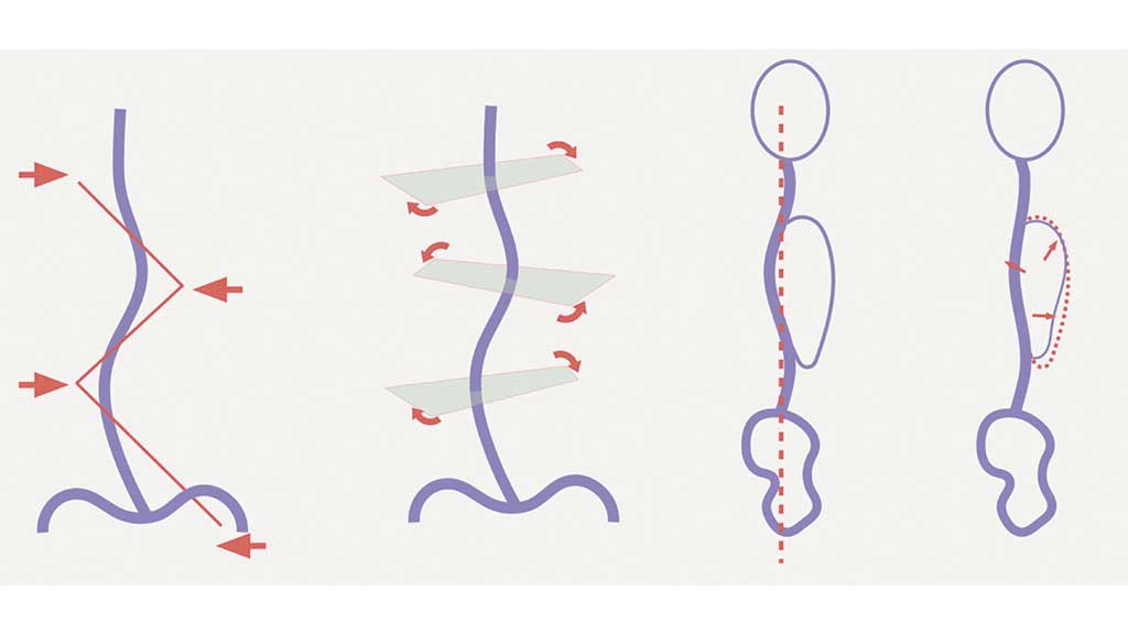 Später präzisierte Manuel D. Rigo die Anforderungen an die Wirkmechanismen einer Skolioseorthese. Er wies darauf hin, dass eine Orthese Atemmechanismen unterstützen sollte, die die strukturelle Lordosierung der Brustwirbelsäule kompensieren29 30. Diese werden durch Dreipunktsysteme in der Frontalebene in Verbindung mit lokalen Derotationszonen erzeugt, welche in der Gesamtheit zur besten physiologischen Ausrichtung im Sagittalprofil führen (Abb. 6).