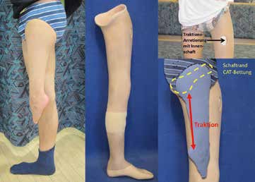 Bei komplettem Fehlen der Tibia ist die dorsokraniale Dislokation der Fibula kaum aufzuhalten. Das Problem dabei ist, dass sich diese Verlagerung limitierend auf die Kniebeugung auswirken kann. Eine frühzeitige Orthoprothesen-Versorgung für den Typ I sollte daher stets oberschenkellang angefertigt werden und über den Weichwandinnenschaft am Unterschenkel und die CAT-Fassung am Oberschenkel ein distrahierendes Moment auf die Fibula ausüben. Mit unterstützenden dynamischen Gasdruckfeder-Einheiten kann die Kniestreckung positiv beeinflusst werden. Problem ist dabei zumeist die fehlende Kraft der knieführenden Muskulatur, insbesondere des M. quadriceps femoris (Abb. 9). Aufgrund des kompletten Fehlens der Tibia wird das Knie nie eine annähernd stabile Situation erreichen können, bei der z. B. auf die Oberhülse in der Konstruktion verzichtet werden könnte.