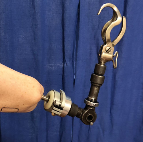 Nach der Erfahrung der Autoren nutzen Patienten nach erfolgreicher Operation und Rehabilitation ihre Prothese vermehrt im täglichen Leben, gegebenenfalls auch für handwerkliche oder landwirtschaftliche Tätigkeiten. Durch die häufige und intensive Verwendung kommt es in der Regel zu einem höheren Verschleiß der verschiedenen Komponenten. Wo es möglich ist, sollte also vorgesehen werden, eine robuste Zweitversorgung zur Verfügung zu stellen. So kann eine myoelektrische Versorgung für den Alltag in Kombination mit einer robusten mechanischen Versorgung für größeren Krafteinsatz und Outdoor-Nutzung ebenso wie unterschiedliche Endgeräte und Adapter sinnvoll sein. Ein Beispiel einer robusten mechanischen Versorgung für landwirtschaftliche Arbeit zeigt Abbildung 4. Einige Patienten wünschen sich zudem eine einfache Schlafprothese, die einen Schutz vor dem harten Abutment und auch ein entsprechendes Gewicht bietet, was viele Patienten als angenehm empfinden.