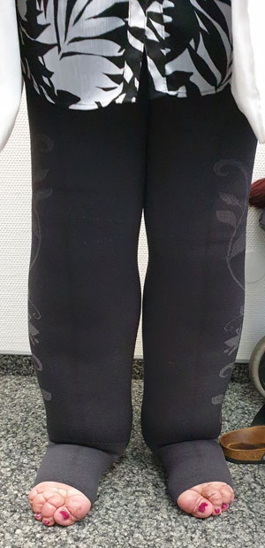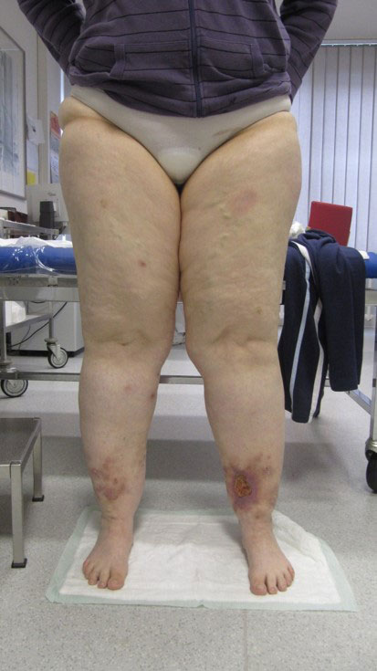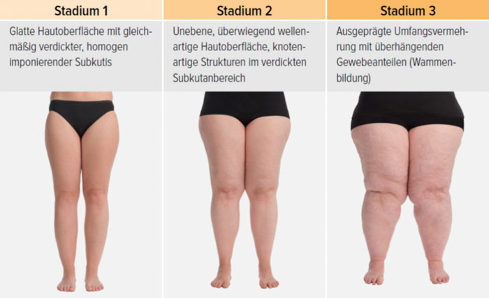 - Stadium III: verdickte Haut, Sklerose, deformierende Fettdepots, großknotige Veränderungen („Wammen“ an Knie und Knöcheln), Verzerrung des Beinprofils (Abb. 1)