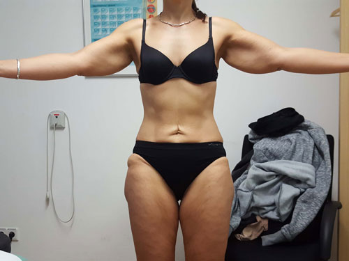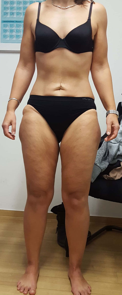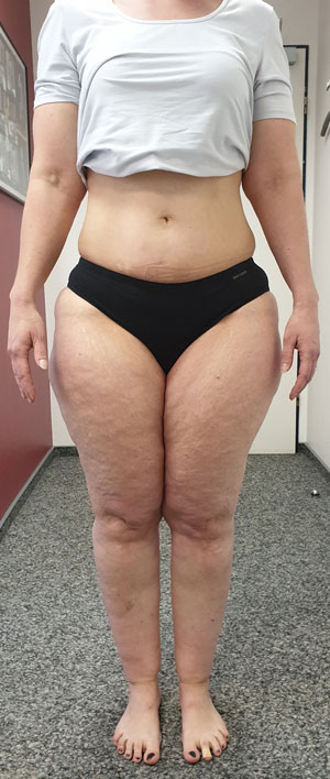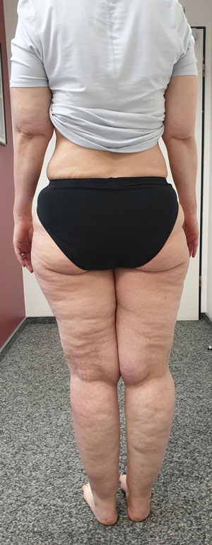 Betrachtet man die Effekte einer Gewichtsabnahme bei adipösen Lipödempatientinnen, lässt sich bereits in den Erstveröffentlichungen aus den Jahren 1940 und 1951 die Feststellung finden, dass in Fällen einer vorliegenden Adipositas eine deutliche Gewichtsabnahme helfe 54. Die weit verbreitete These, dass sich das Lipödem-Fettgewebe an Armen und Beinen durch eine Gewichtsreduktion ja gar nicht verringern könne, ist im klinischen Alltag nicht haltbar. Die Aussage, dass eine Verbesserung der Beschwerden durch Diät und Sport nicht möglich sei, widerspricht den geschilderten Erfahrungsberichten großer lymphologischer Ambulanzen. Ein pathophysiologisches Konzept zur Erklärung dieser „Diät-Resistenz“ gibt es bisher nicht 55. Vielmehr lässt sich empirisch eine deutliche Beschwerdebesserung bei Lipödempatientinnen bei nachhaltiger Gewichtsreduktion mit reduzierter Schmerzhaftigkeit, besserer Selbstakzeptanz, Umfangsabnahme an den betroffenen Extremitäten und hierdurch größerer Bewegungsmöglichkeit feststellen 56 (Abb. 7 u. 8).