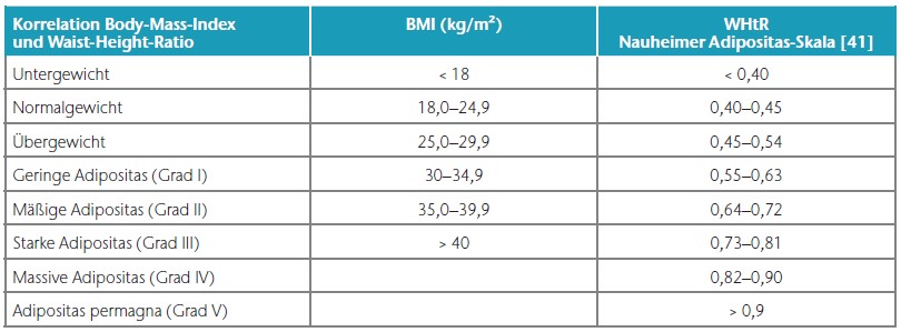 In allen und speziell diesen grenzwertigen Fällen mit einem BMI von 25 bis 30 kg/m² empfiehlt sich gleichzeitig die Bestimmung der sogenannten Waist-to-Height-Ratio (WHtR), auch Bauch-Größen-Quotient (BGQ) genannt, die – korrekt gemessen – diese Disproportionalität berücksichtigt (Nauheimer Adipositas-Skala) 47. Ein Beispiel: Bei einer 30-jährigen Frau mit disproportionaler Fettgewebevermehrung an den Oberschenkeln und am Gesäß wird eine Größe von 170 cm, ein Gewicht von 90 kg, ein Taillenumfang von 75 cm sowie ein Hüftumfang von 110 cm gemessen. Das ergibt gemäß BMI-Formel eine leichtgradige Adipositas (BMI 31 kg/ m²). Nach der Nauheimer Adipositas-Skala dagegen ergibt sich eine WHtR von nur 0,44, also gemäß Definition ein Normalgewicht (WHtR 0,40– 0,45). Bei derselben Patientin mit einem angenommenen Taillenumfang von 100 cm beträgt die WHtR dann aber 0,59 – nun besteht also auch hier formal eine leichtgradige Adipositas (WHtR 0,55–0,63) (Tab. 1) (Abb. 3–5).